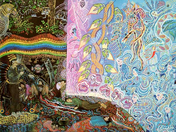 Some biologists describe DNA as an "ancient high biotechnology," containing "over a hundred trillion times as much information by volume as our most sophisticated information storage devices." Could one still speak of technology in these circumstances? Yes, because there is no other word to qualify this duplicable, information-storing molecule. DNA is only ten atoms wide and as such constitutes a sort of ultimate technology: It is organic and so miniturized that it approaches the limits of material existence.Shamans, meanwhile, claim that the vital principle that animates all living creatures comes from the cosmos and is minded. As ayahuasquero Pablo Amaringo says: "A plant may not talk, but there is a spirit in it that is conscious, that sees everything, which is the soul of the plant, its essence, what makes it alive." According to Amaringo these spirits are veritable beings, and humans are also filled with them: "Even the hair, the eyes, the ears are full of beings. You see all this when ayahuasca is strong."